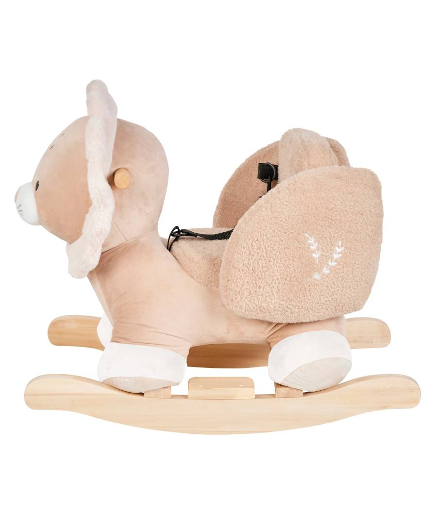 Diseñado para balanceo seguro: amplia base de madera con reposapiés, incluido un cinturón de seguridad, asiento acolchado suave con soportes laterales y manijas para manos pequeñas.