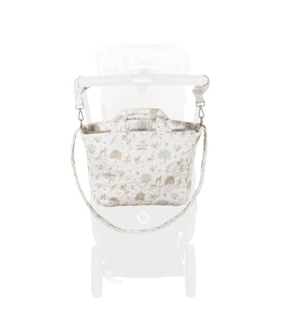 La bolsa para carrito de bebé Nara de Pasito a pasito es un modelo elaborado en loneta de algodón 100% con un delicado estampado de ciervos y árboles en tonos neutros. Su tratamiento waterproof la hace resistente al agua, garantizando protección y durabilidad en el día a día.
