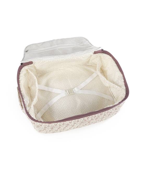 Se puede cerrar con cremallera, tiene un amplio interior con pequeños compartimentos adicionales y tiras elásticas para sujetar la ropa.